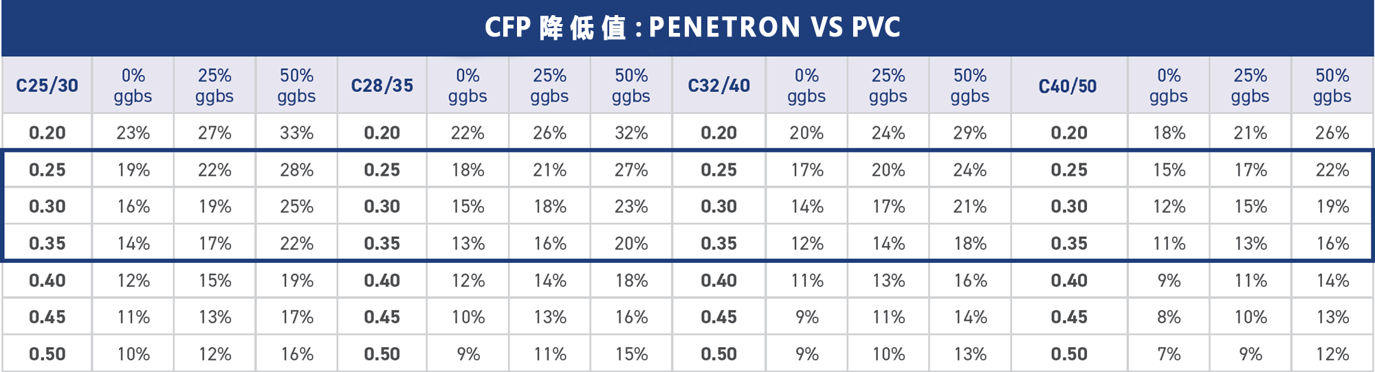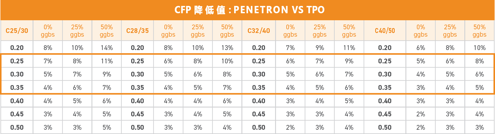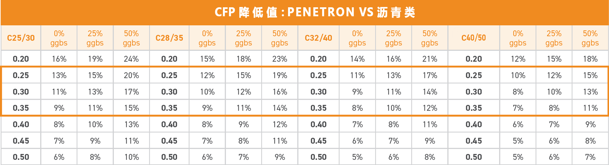 按照結(jié)構(gòu)平均厚度0.25-0.35m計算每平方米混凝土的CFP,將PENETRON ADMIX 澎內(nèi)傳混凝土防水添加劑(PNC803)與上述表面處理方案進(jìn)行比較?,結(jié)果見右表。